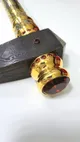Корпус топора выполнен из дамасской стали, известной своей прочностью и исключительной красотой. Острое лезвие, надежно удерживаемое в рукояти, гарантирует безупречную функциональность. Рукоять изготовлена из благородного дерева, подчеркнута элементом декора из латуни, покрытой позолотой, и украшена натуральными гранатами, что придает изделию неповторимый вид.